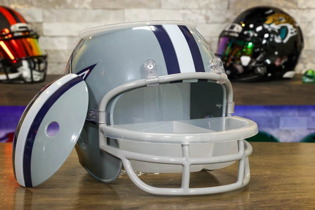 You love hosting tailgate and homegate parties for all the big games. No party is fully complete without some delicious snacks. Now, you can pay homage to your beloved team while showcasing some tasty treats with this Party snack helmet. It'll make your steadfast loyalty abundantly clear with the crisp team graphics. Snack helmets have a large container in the helmet and a smaller tray with two compartments in the facemask (Football) or one smaller tray with no divider (Racing). Helmets are approximately 10" high x 9.25" wide x 12" deep. The container and tray are microwavable and dishwasher safe. Made in the USA. Officially licensed.