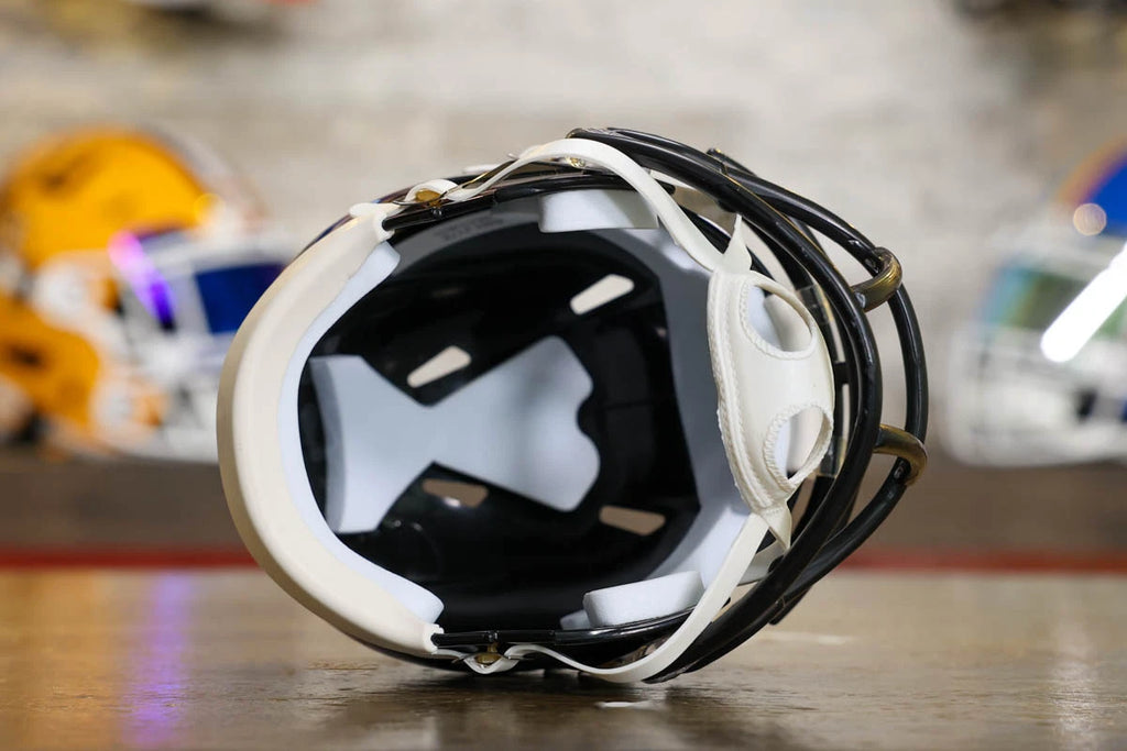 The Riddell Speed Mini Helmets are an easy and affordable way to join the collectors club and they make a perfect gift that everyone loves without breaking the bank! Riddell mini helmets are about half the size of the Authentic and Replica helmets. They model the official team designs and colors on a smaller scale. Coming in at about 6” tall, you can collect all your teams’ mini’s without taking up much room. Put them on your desk, a shelf, your dashboard, or get a Mini Helmet Hanger and put them on the wall!