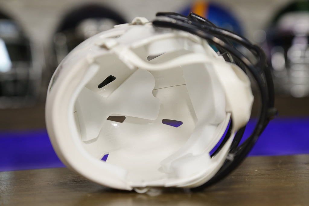 The Riddell Speed Mini Helmets are an easy and affordable way to join the collectors club and they make a perfect gift that everyone loves without breaking the bank! Riddell mini helmets are about half the size of the Authentic and Replica helmets. They model the official team designs and colors on a smaller scale. Coming in at about 6” tall, you can collect all your teams’ mini’s without taking up much room. Put them on your desk, a shelf, your dashboard, or get a Mini Helmet Hanger and put them on the wall!