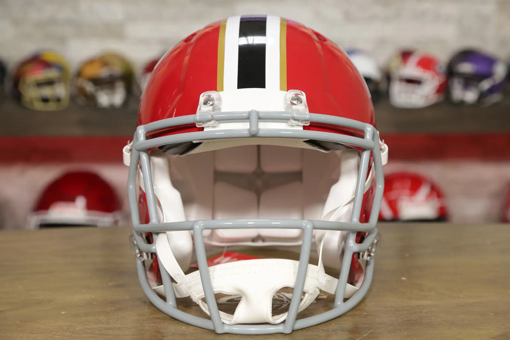 The Riddell Speed helmet is one of the most popular and iconic styles in history and one of the most sought after by collectors! These officially licensed helmets are perfect for display, collecting autographs, and showing off your team spirit. We recommend your helmet be displayed prominently on a shelf or on the wall with a Helmet Hanger, the same way we and many teams do! Available in any of the same 35+ colors we offer for facemasks, each hanger is coated to order.