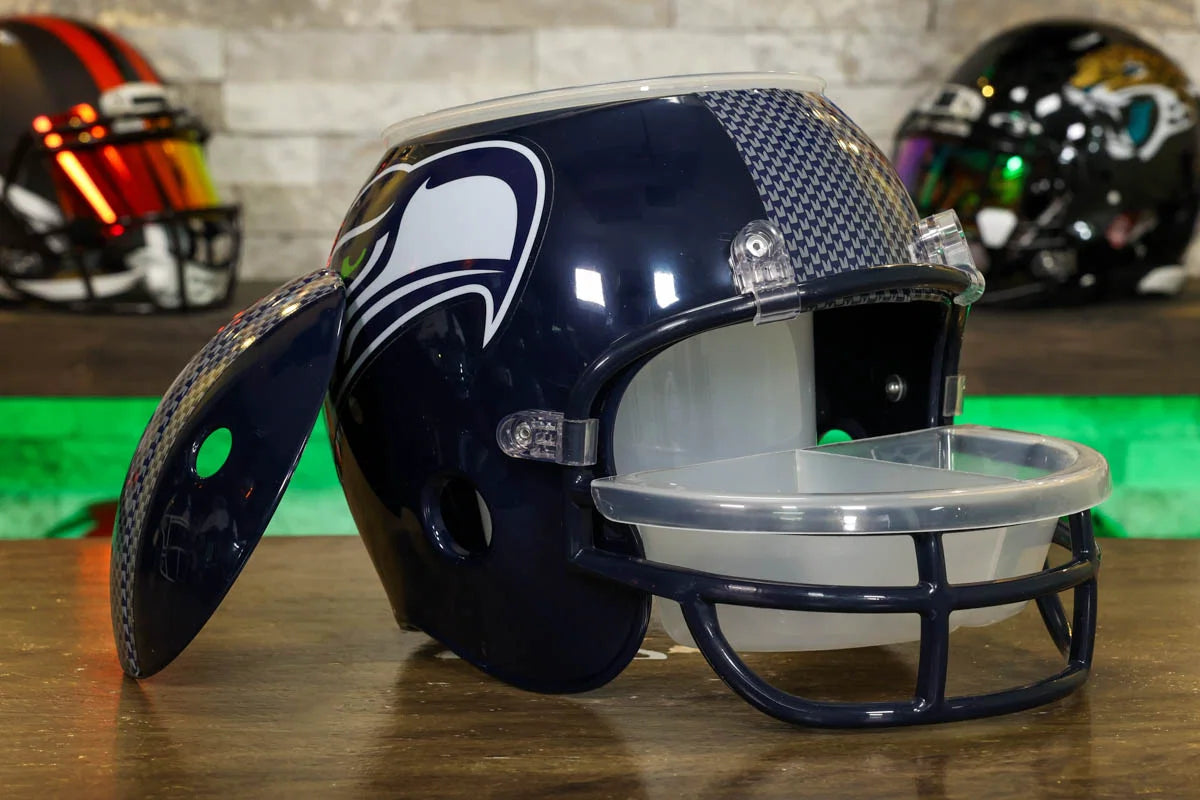 You love hosting tailgate and homegate parties for all the big games. No party is fully complete without some delicious snacks. Now, you can pay homage to your beloved team while showcasing some tasty treats with this Party snack helmet. It'll make your steadfast loyalty abundantly clear with the crisp team graphics. Snack helmets have a large container in the helmet and a smaller tray with two compartments in the facemask (Football) or one smaller tray with no divider (Racing). Helmets are approximately 10" high x 9.25" wide x 12" deep. The container and tray are microwavable and dishwasher safe. Made in the USA. Officially licensed.