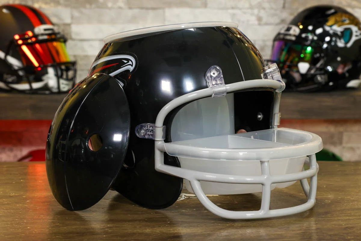 You love hosting tailgate and homegate parties for all the big games. No party is fully complete without some delicious snacks. Now, you can pay homage to your beloved team while showcasing some tasty treats with this Party snack helmet. It'll make your steadfast loyalty abundantly clear with the crisp team graphics. Snack helmets have a large container in the helmet and a smaller tray with two compartments in the facemask (Football) or one smaller tray with no divider (Racing). Helmets are approximately 10" high x 9.25" wide x 12" deep. The container and tray are microwavable and dishwasher safe. Made in the USA. Officially licensed.