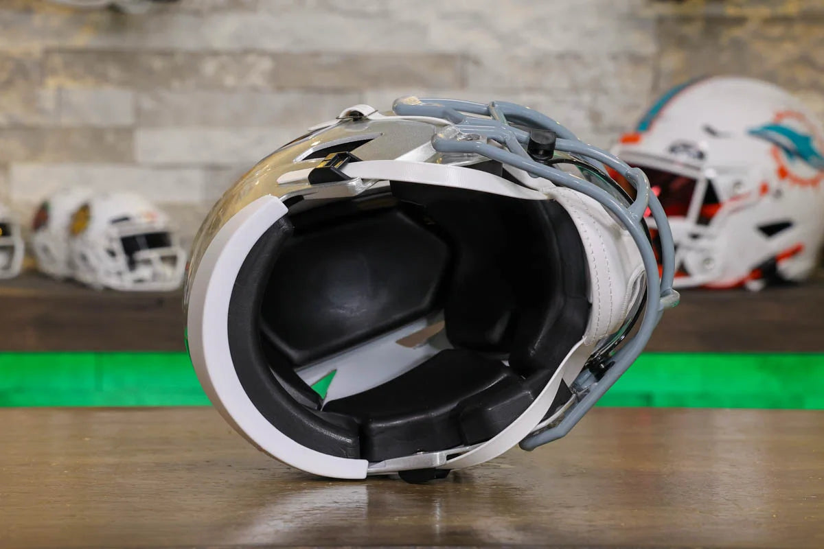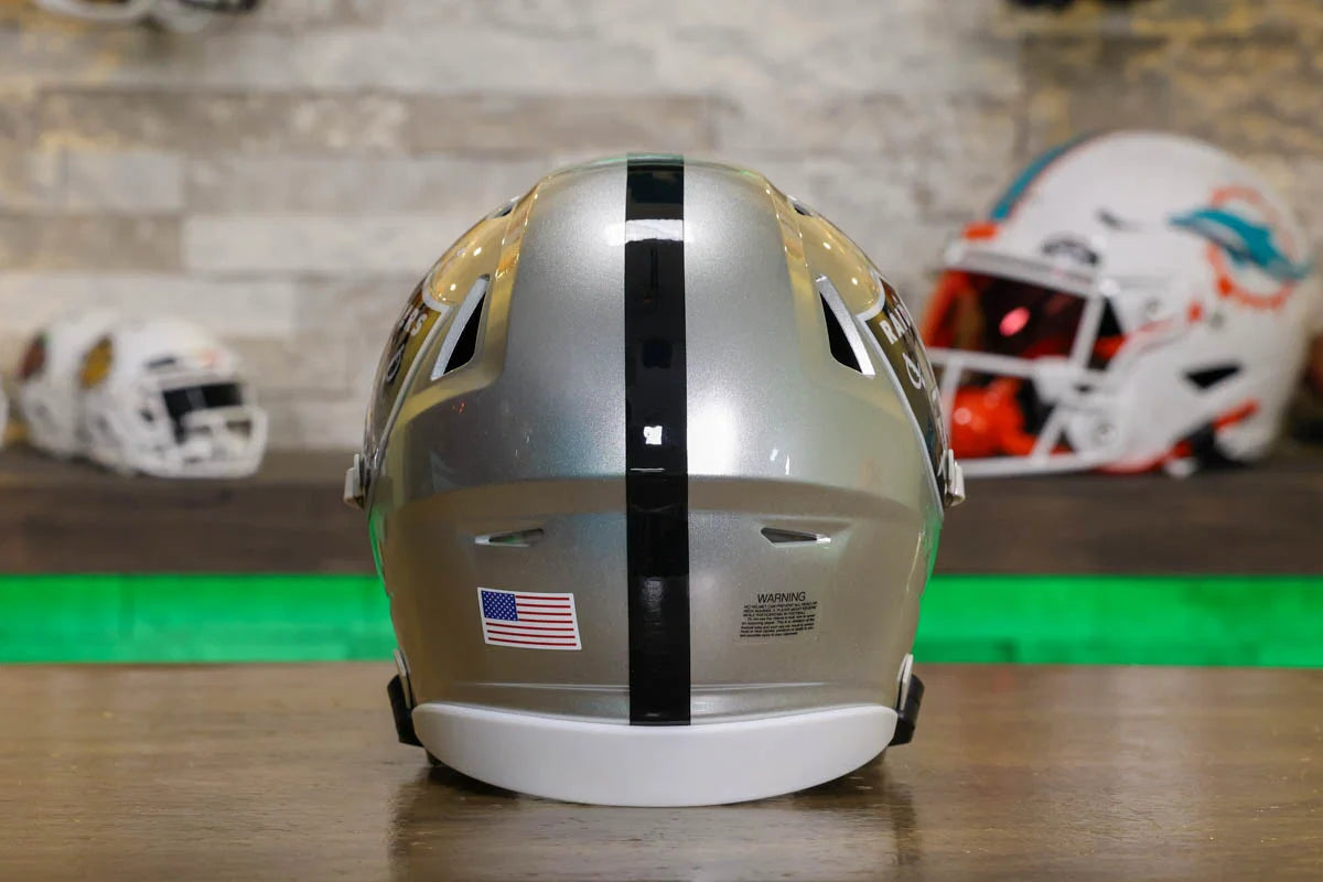 Las Vegas Raiders SpeedFlex Mid-Size Football Helmet – A must-have collectible for Raiders fans and autograph seekers. This officially licensed mid-size helmet features the iconic SpeedFlex shell, SF-2BD-SW face mask, authentic team decals, internal padding, soft-cup chinstrap, and a clear visor. Sized between a replica and a mini helmet, it’s ideal for display, signing events, or gifting. Affordable, detailed, and game-inspired—perfect for any fan cave or collection.