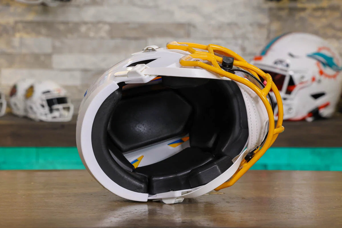 Los Angeles Chargers SpeedFlex Mid-Size Football Helmet – A must-have collectible for Chargers fans and autograph seekers. This officially licensed mid-size helmet features the iconic SpeedFlex shell, SF-2BD-SW face mask, authentic team decals, internal padding, soft-cup chinstrap, and a clear visor. Sized between a replica and a mini helmet, it’s ideal for display, signing events, or gifting. Affordable, detailed, and game-inspired—perfect for any fan cave or collection.