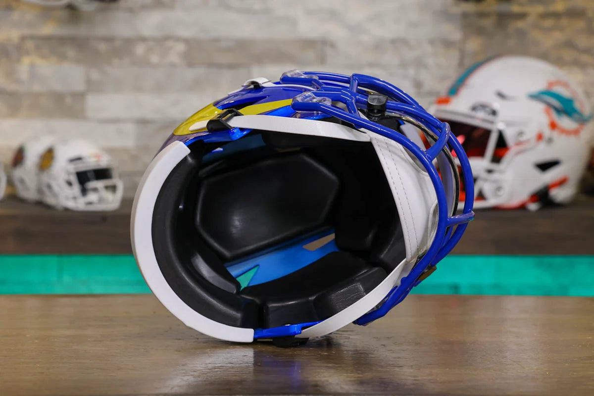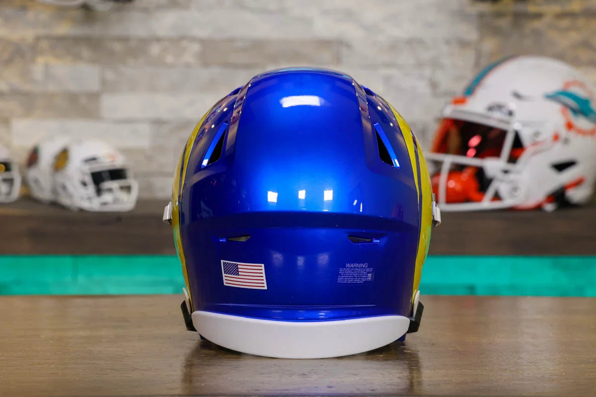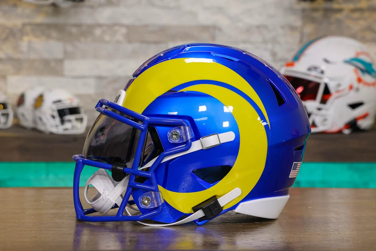 Los Angeles Rams SpeedFlex Mid-Size Football Helmet – A must-have collectible for Rams fans and autograph seekers. This officially licensed mid-size helmet features the iconic SpeedFlex shell, SF-2BD-SW face mask, authentic team decals, internal padding, soft-cup chinstrap, and a clear visor. Sized between a replica and a mini helmet, it’s ideal for display, signing events, or gifting. Affordable, detailed, and game-inspired—perfect for any fan cave or collection.