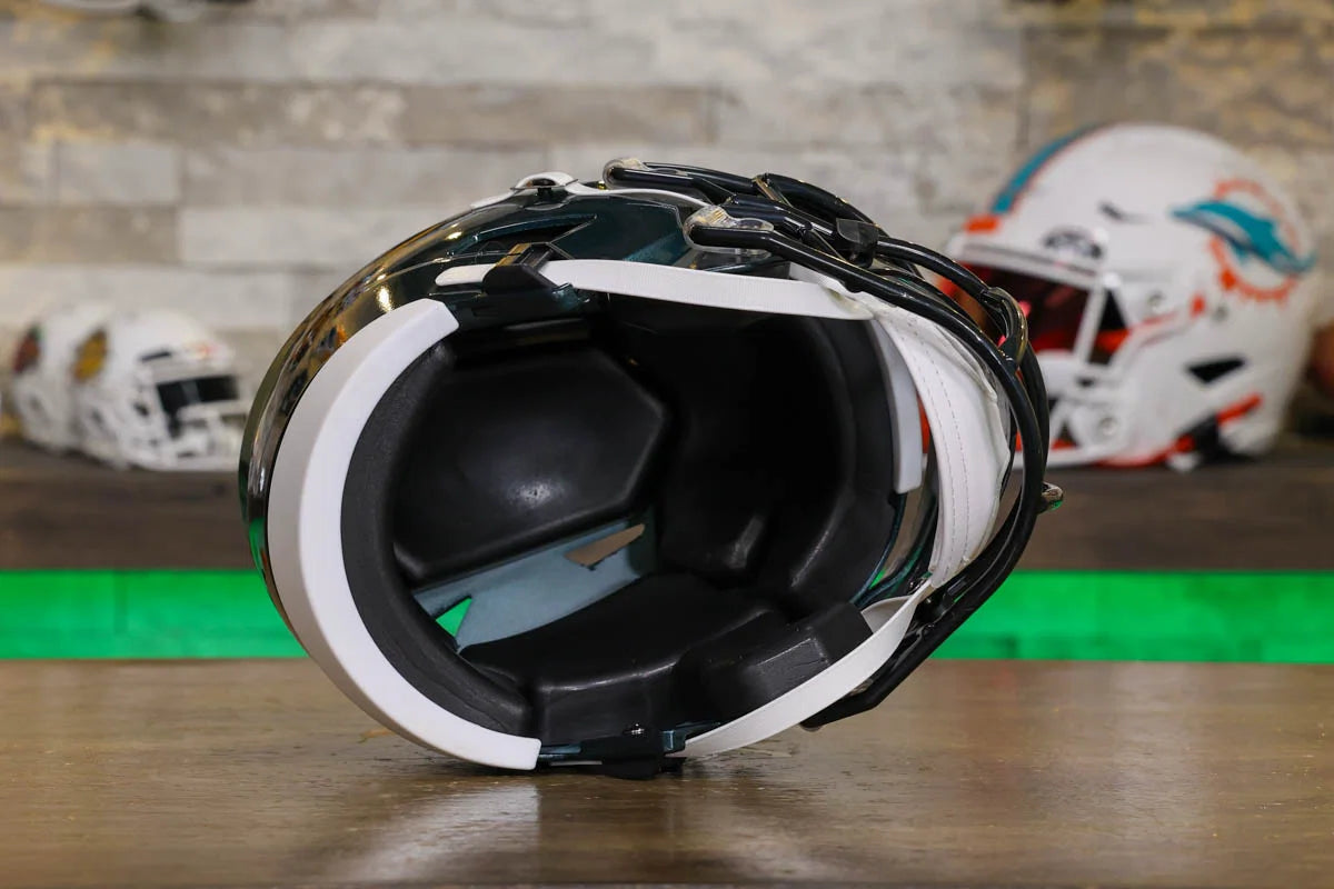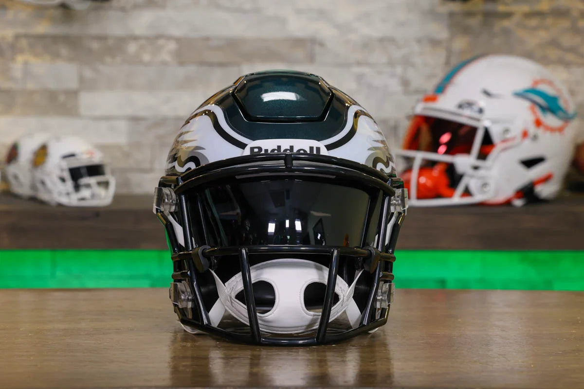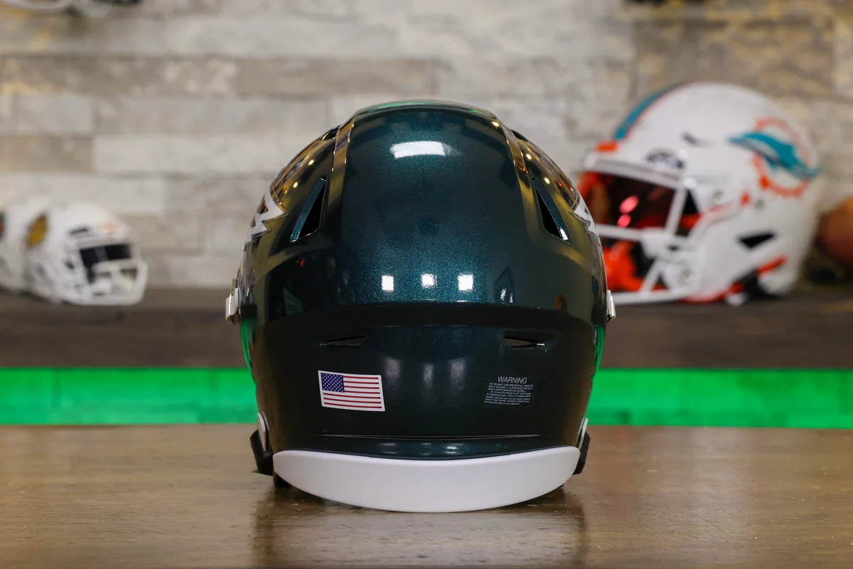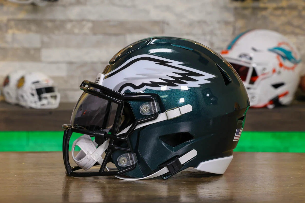 Philadelphia Eagles SpeedFlex Mid-Size Football Helmet – A must-have collectible for Eagles fans and autograph seekers. This officially licensed mid-size helmet features the iconic SpeedFlex shell, SF-2BD-SW face mask, authentic team decals, internal padding, soft-cup chinstrap, and a clear visor. Sized between a replica and a mini helmet, it’s ideal for display, signing events, or gifting. Affordable, detailed, and game-inspired—perfect for any fan cave or collection.
