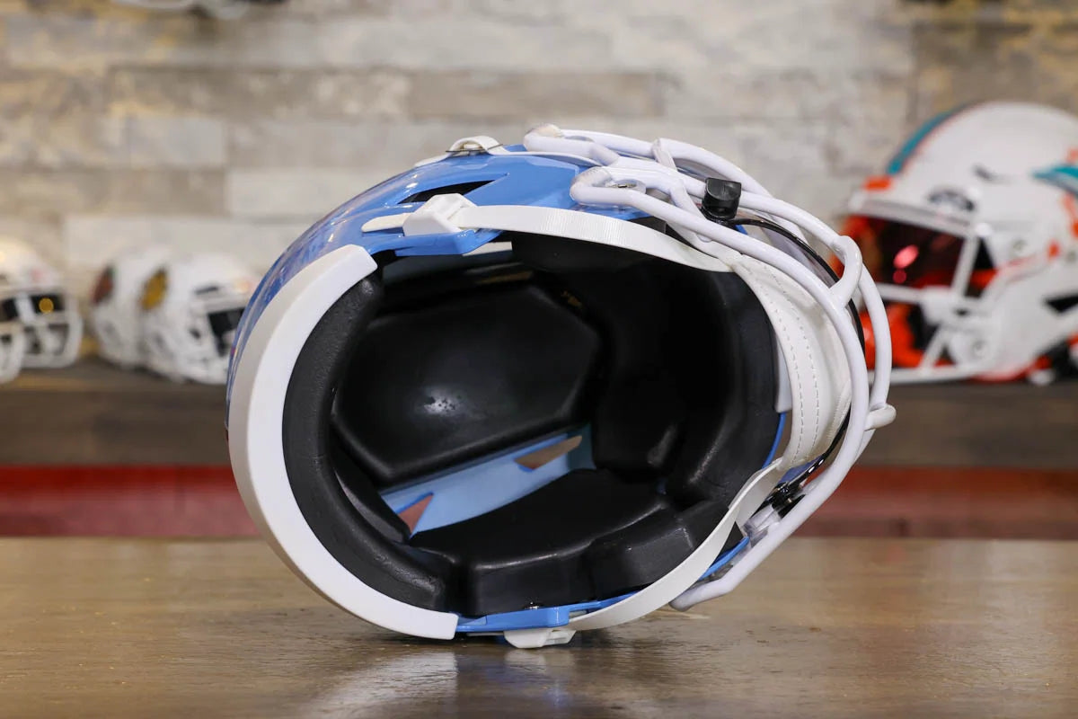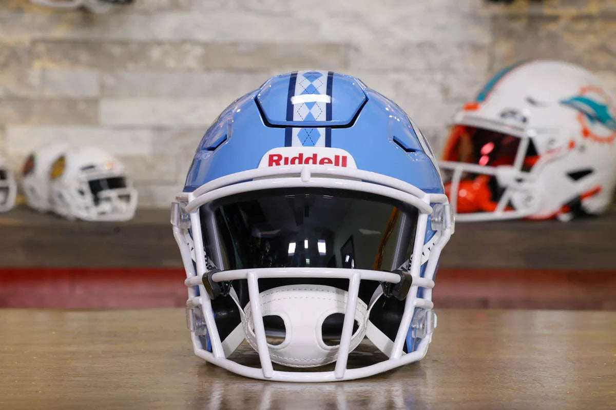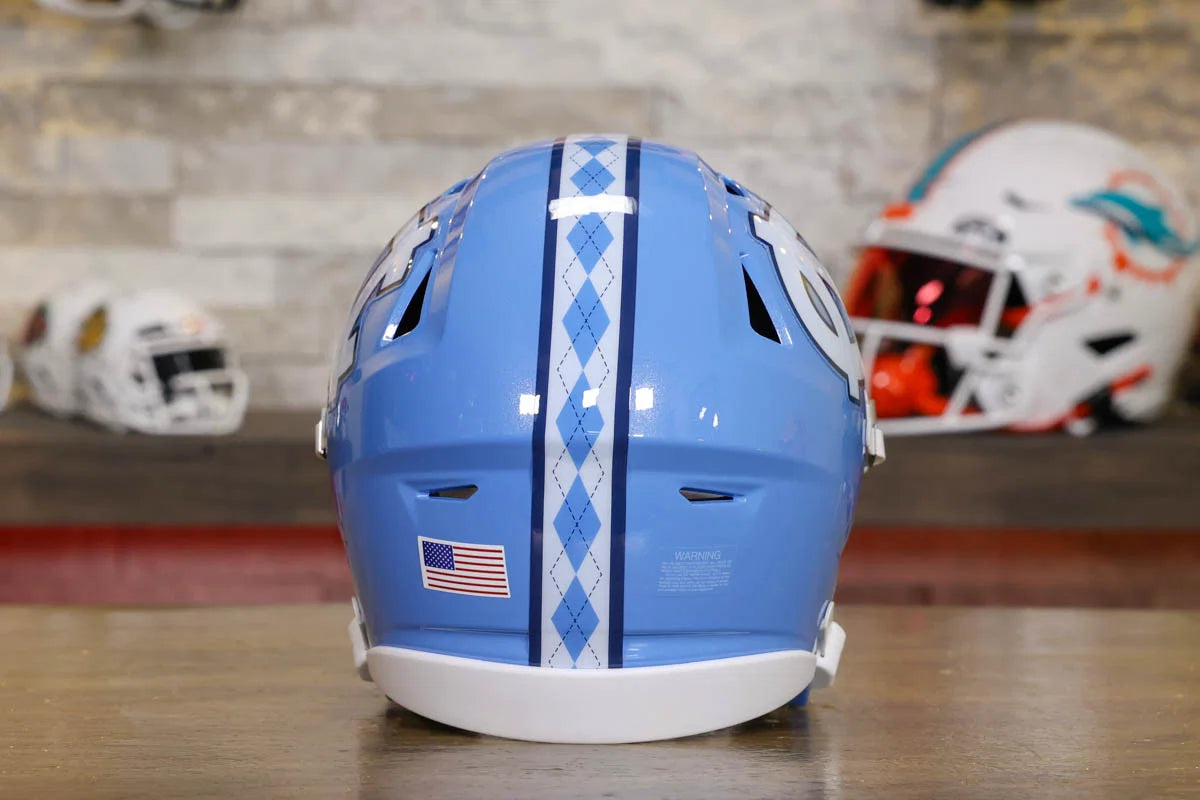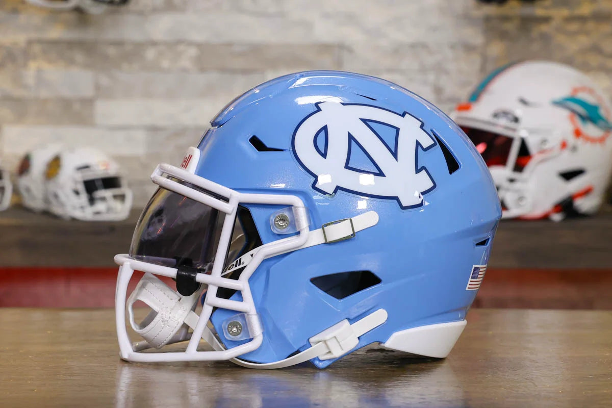 North Carolina Tar Heels SpeedFlex Mid-Size Football Helmet – A must-have collectible for Tar Heels fans and autograph seekers. This officially licensed mid-size helmet features the iconic SpeedFlex shell, SF-2BD-SW face mask, authentic team decals, internal padding, soft-cup chinstrap, and a clear visor. Sized between a replica and a mini helmet, it’s ideal for display, signing events, or gifting. Affordable, detailed, and game-inspired—perfect for any fan cave or collection.