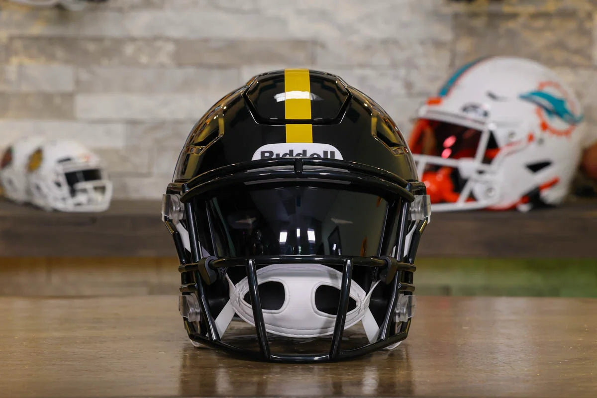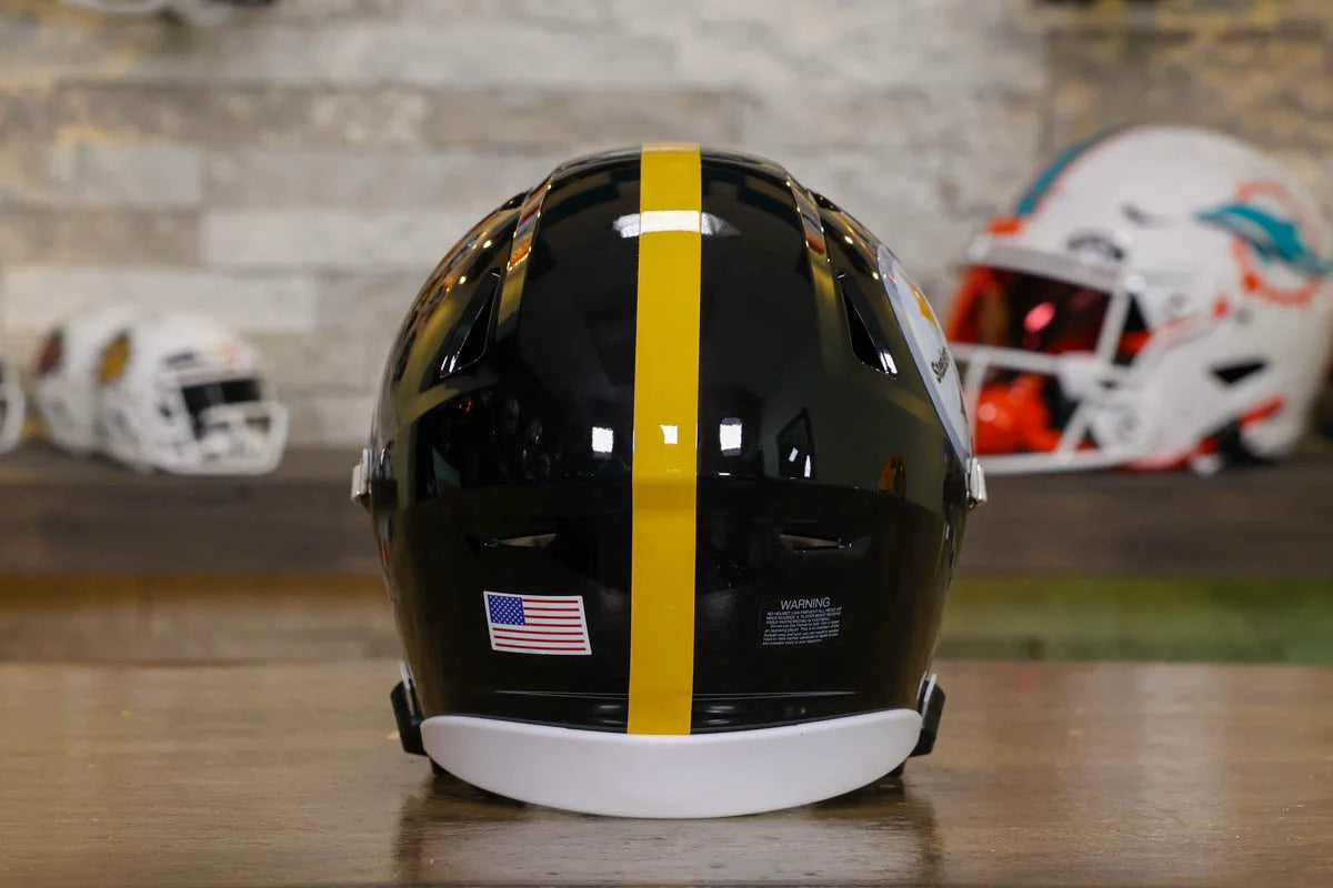 Pittsburgh Steelers SpeedFlex Mid-Size Football Helmet – A must-have collectible for Steelers fans and autograph seekers. This officially licensed mid-size helmet features the iconic SpeedFlex shell, SF-2BD-SW face mask, authentic team decals, internal padding, soft-cup chinstrap, and a clear visor. Sized between a replica and a mini helmet, it’s ideal for display, signing events, or gifting. Affordable, detailed, and game-inspired—perfect for any fan cave or collection.