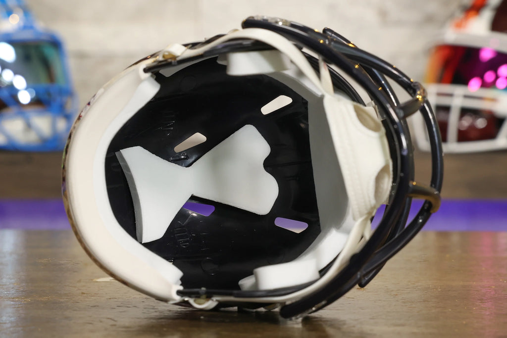 Mini Helmets are an easy and affordable way to join the collectors club and they make a perfect gift that everyone loves without breaking the bank! Mini helmets are about half the size of the Authentic and Replica helmets. They model the official team designs and colors on a smaller scale. Coming in at about 6” tall, you can collect all your teams’ mini’s without taking up much room. Put them on your desk, a shelf, your dashboard, or get a Mini Helmet Hanger and put them on the wall!