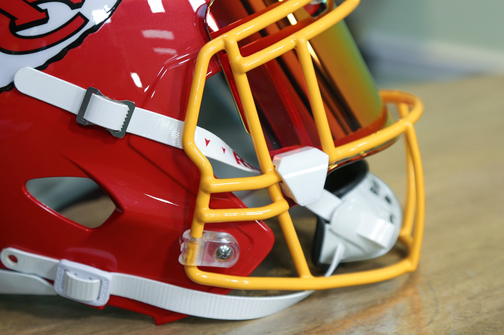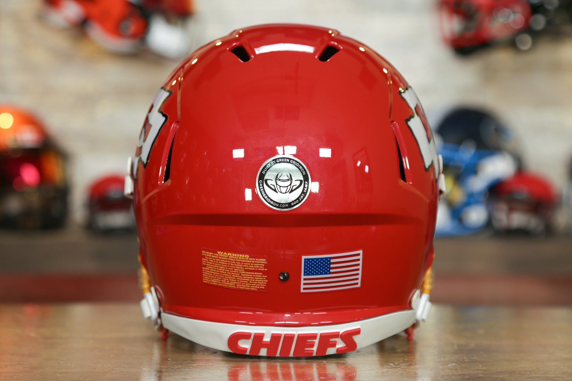 This Kansas City Chiefs Helmet is a Green Gridiron masterpiece, ready for the biggest Chiefs fan!