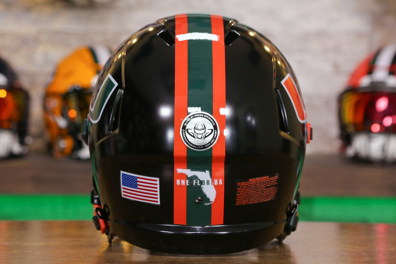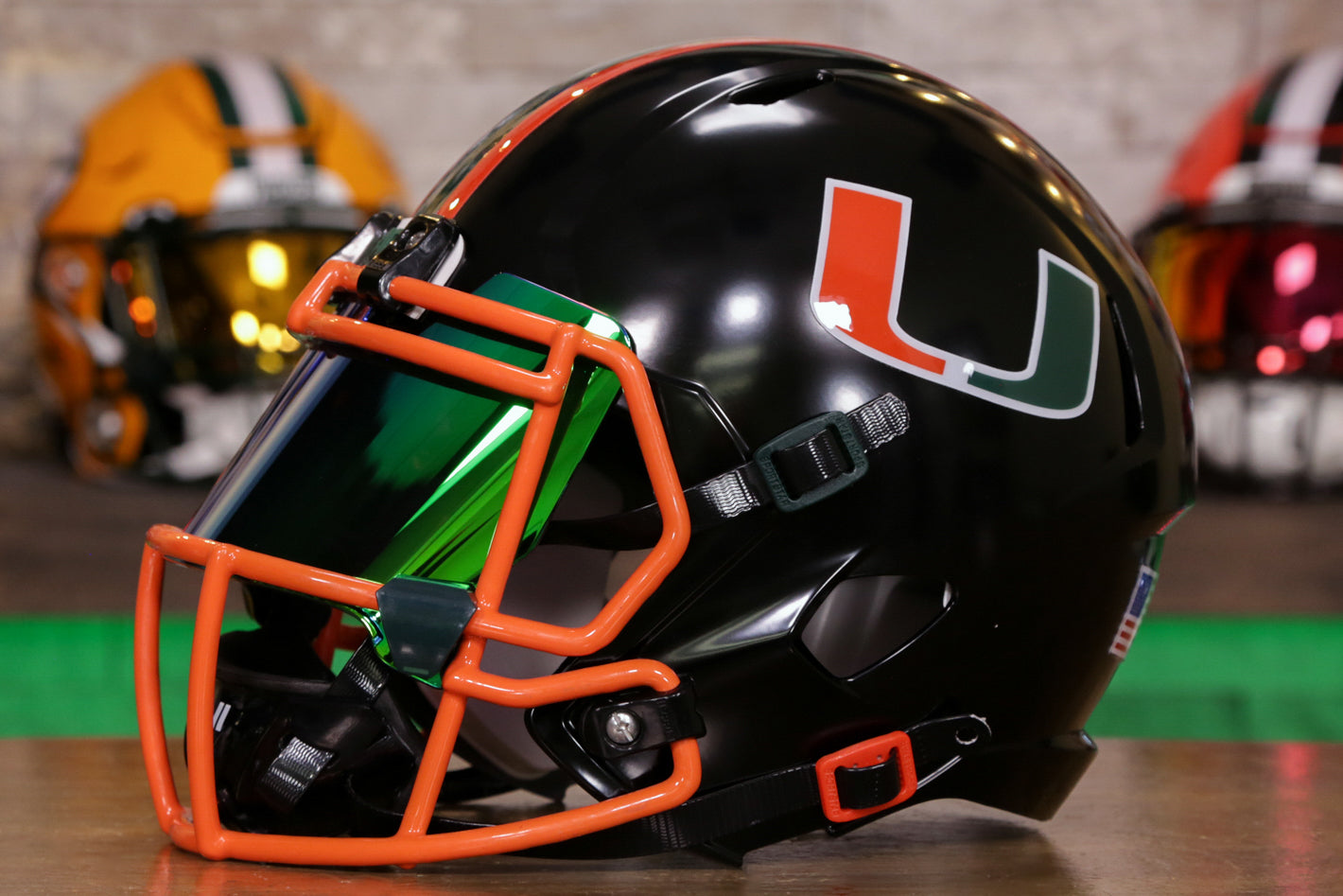 This Miami Hurricanes Helmet is a Green Gridiron masterpiece, ready for the biggest Canes fan!